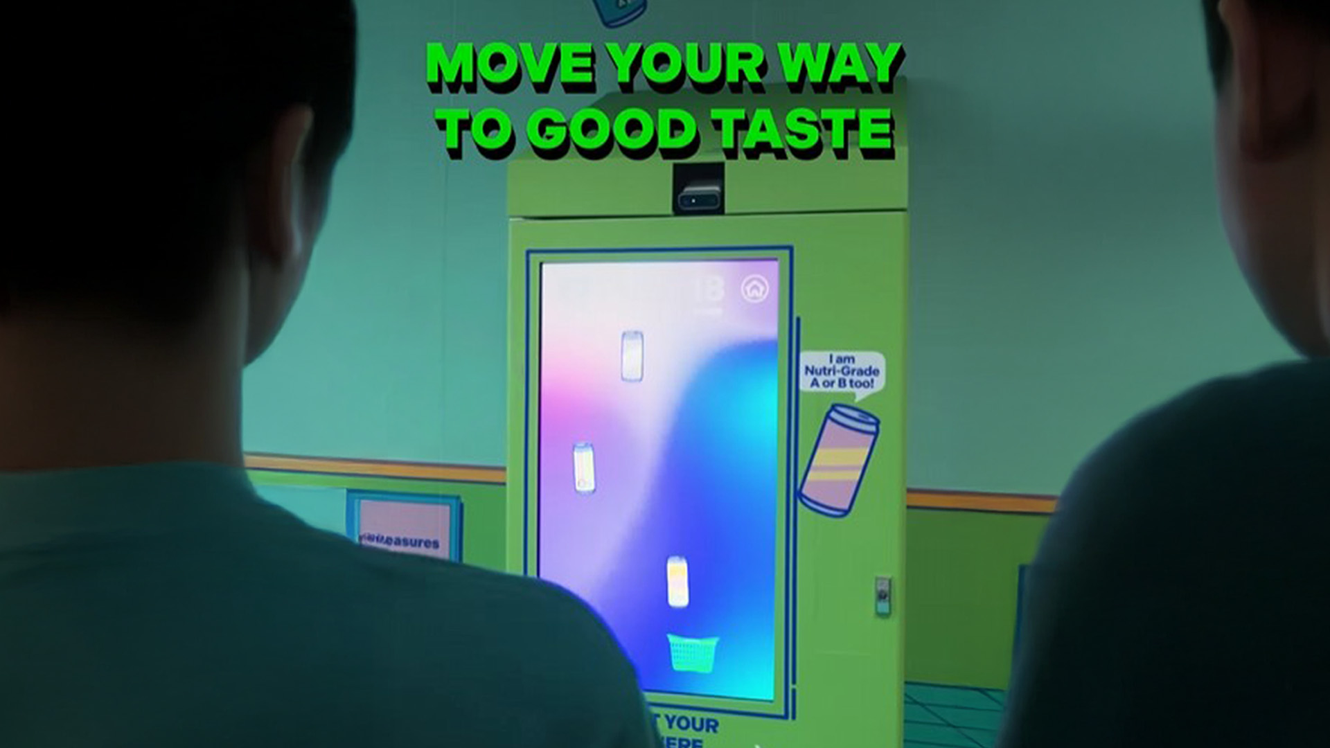 Nutrigrade Interactive Vending Machine by HPB, users use body motion to catch falling cans of drinks.