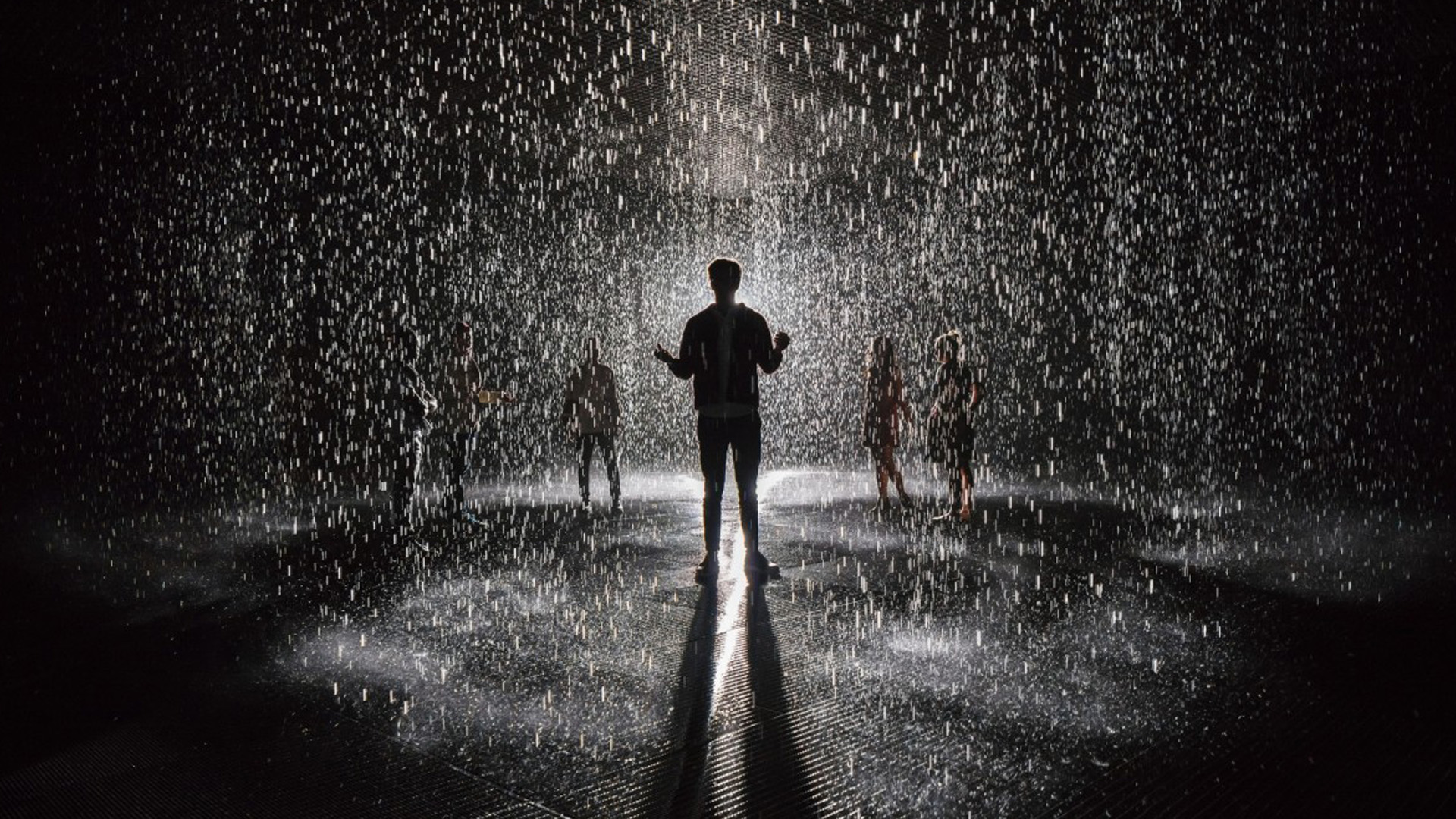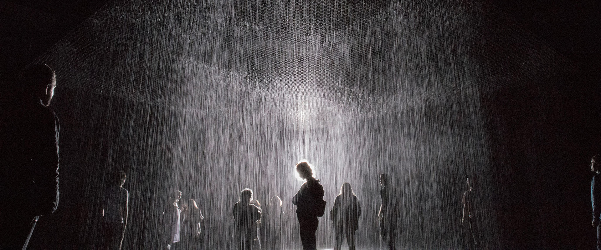 Rain Room by Random International, participants walk through a raining room without getting wet.