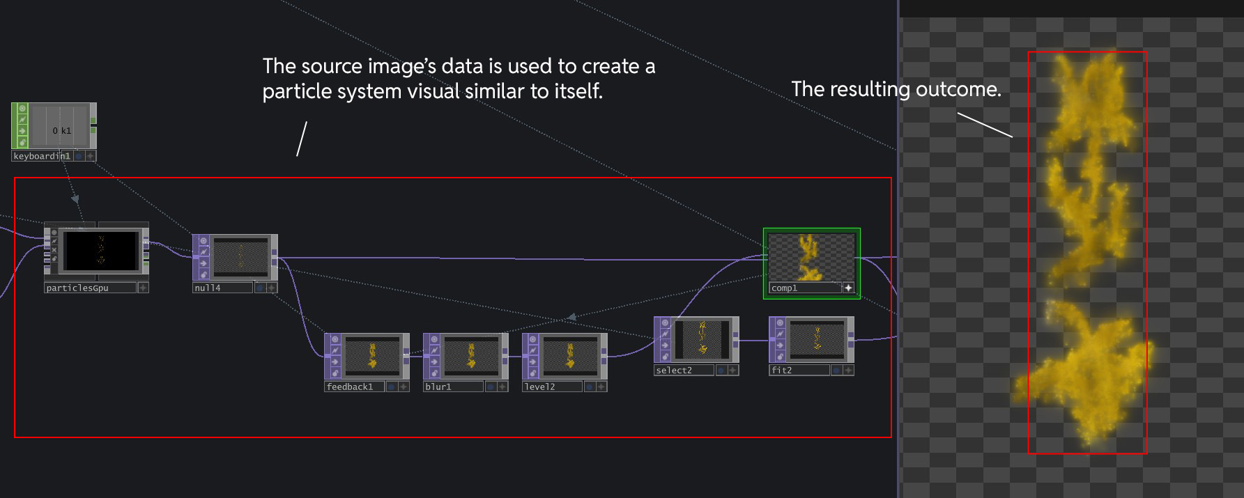 PPPANIK uses the Noise2 and Noise3 nodes to recolor the particles that was generated at the previous step. This recolored particle system is then placed behind another instance of the source image, which is also recolored by the same Noise TOPs due to the Inside TOP.