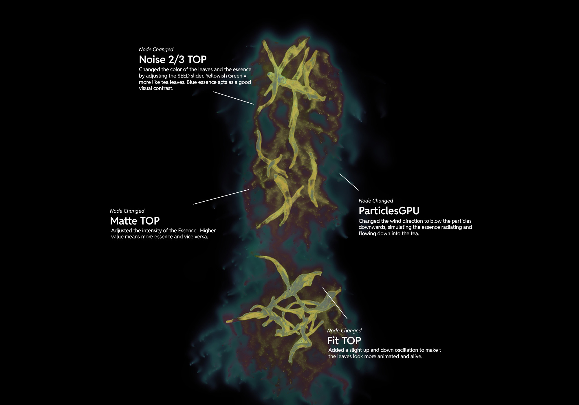 Above is not the full extensive nodes that I changed, but those are the main ones. After understanding how the visual worked, I slowly tweaked the nodes one by one to be closer to the leaves visual that I wanted -- leaves radiating its essence downwards slowly as the tea is brewing in the physical brewing cup.
