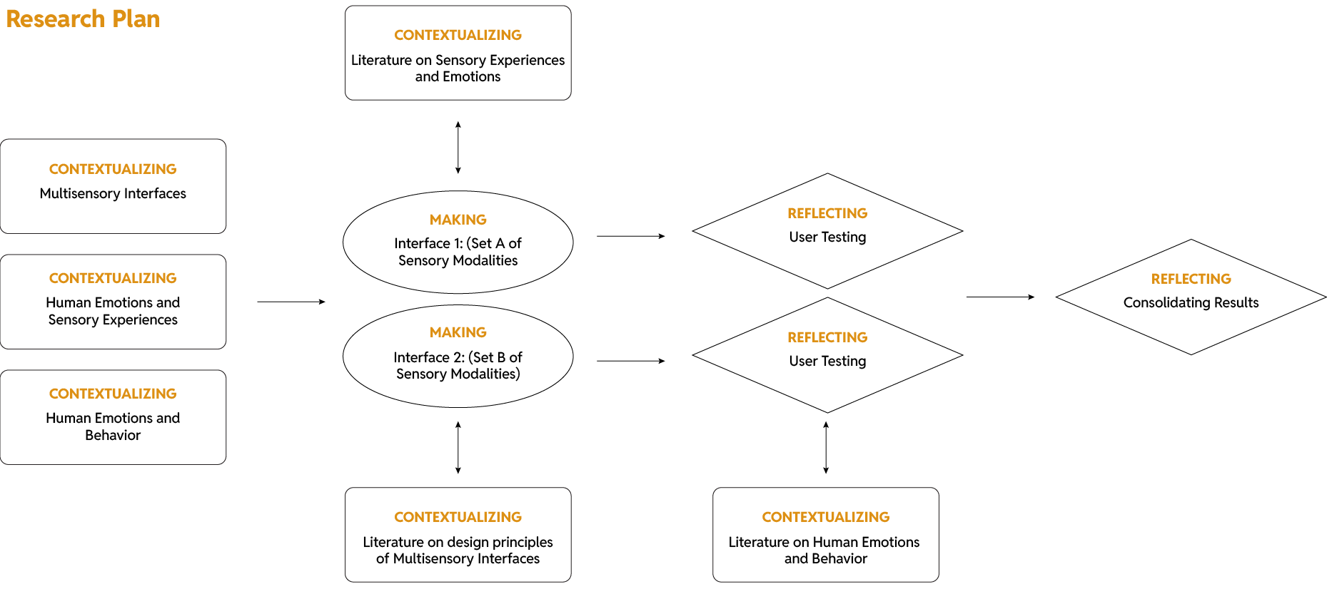 Following the lesson by Shu Min, I did a rough mindmap which details the process of my experimentation. I plan to introduce different sets of Multisensory Interfaces that consists of varying sets of sensory modalities to test the effectiveness of the implementation of Sensorial Principles within the interface design (I.E Varying stimuli congruency). The making stage will be supported by literatures on Sensorial Principles and Multisensory Interface Design to help guide my making. The outcomes will be reflected on and consolidated to make sense of the findings.