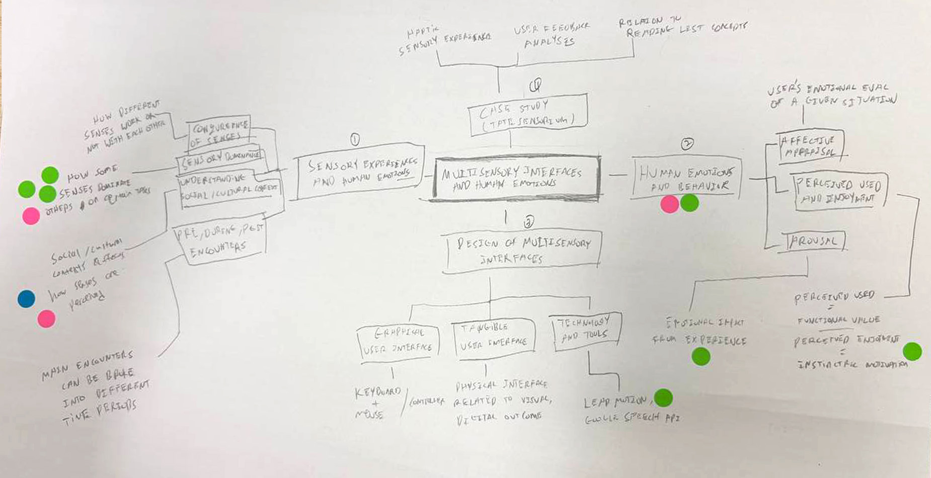 In Thursday's class, we did a quick mindmapping exercise where we detailed our concepts into it’s respective pillars. We had the chance to walk around to glance at each other’s mindmap, and use stickers to highlight what was interesting. For me, many people placed their stickers on the concept of sensorial dominance and also the considerations of cultural and societal context in sensorial experiences. It was a interesting observation that many people were curious about the sensorial principle side of things, but not one which was inspiring to me. Personally, I wanted to focus more on the design aspects of Multisensory Interfaces and have sensorial principles as a supporting factor.