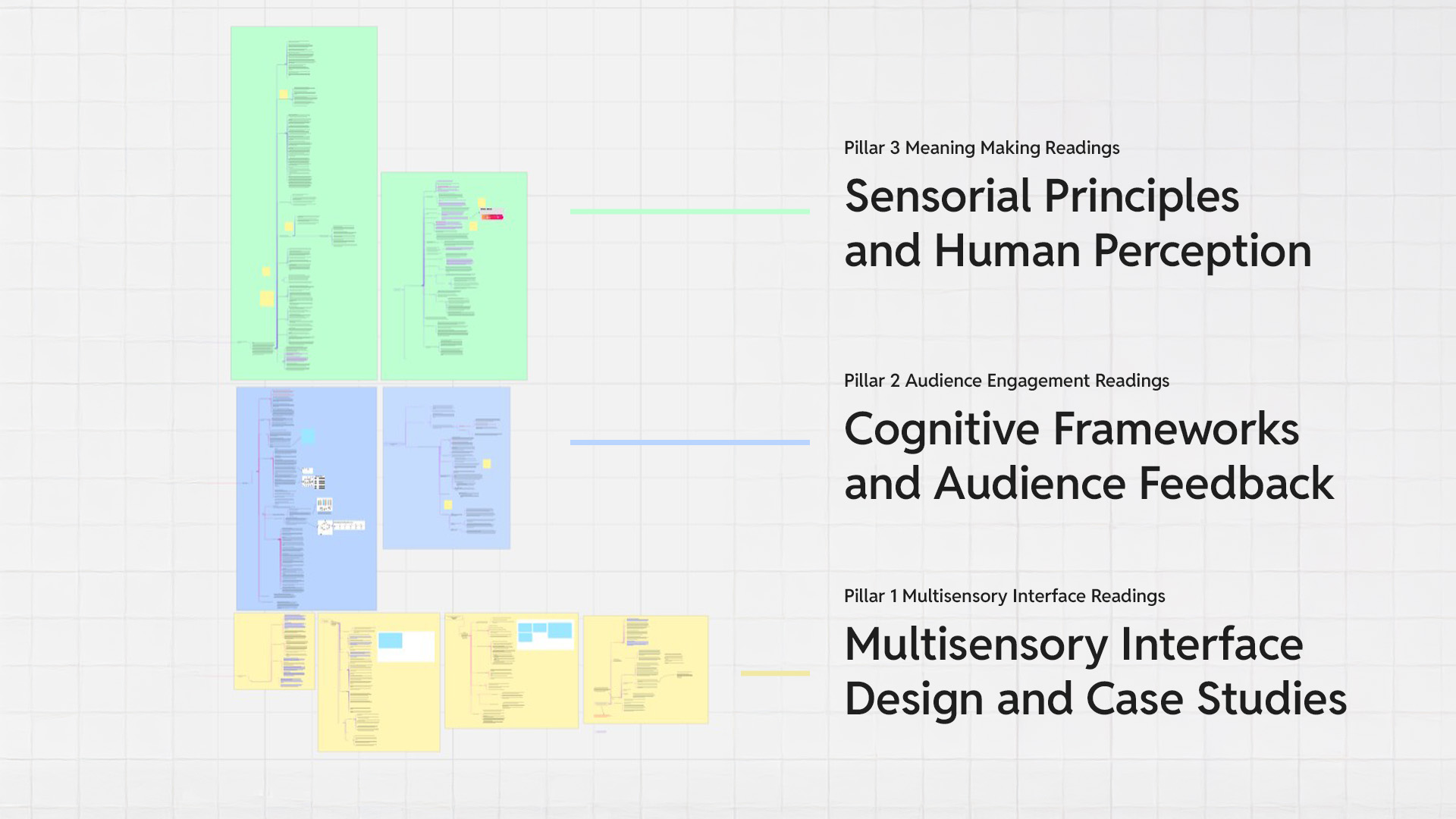 Over the course the past few weeks, I have compiled more readings and oraganised them within my Miroboard. I grouped them according to their relevance to the pillars that I currently have, but their references are not solely contained within the pillars but can be cross referenced with each other. Within all of these frames are individual readings with notes that I took diligently!