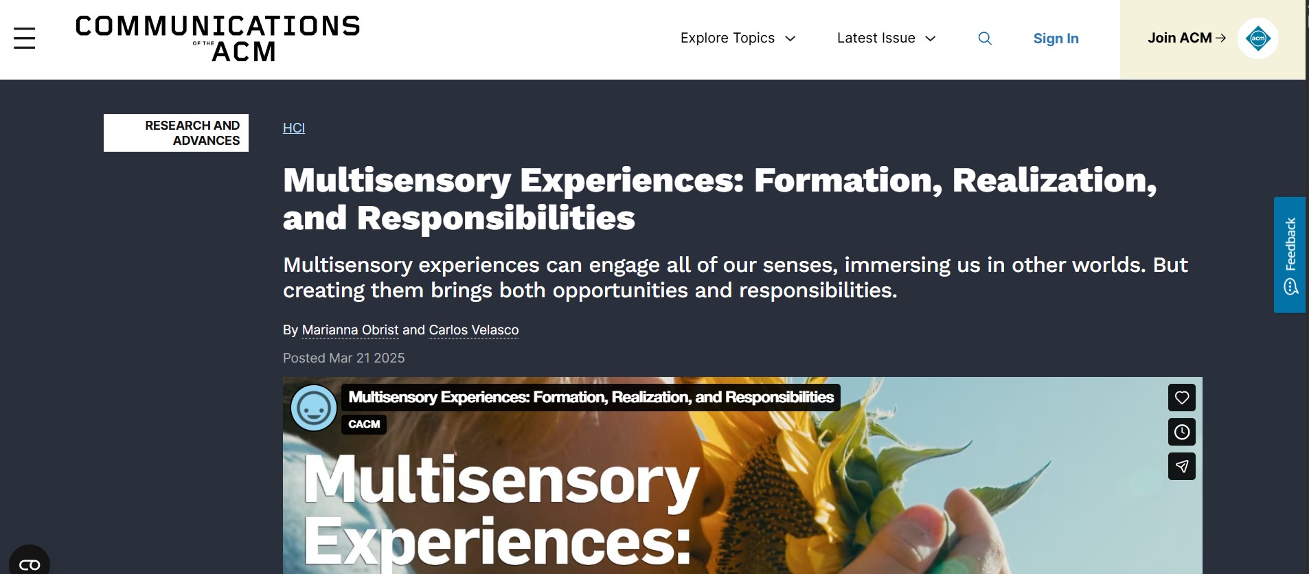 This research article looks into the various components that makes up a user's journey in a multisensory experience, such as how we perceive sensory stimuli and how that leads to our understanding of our environment. There are also case studies given of Multisensory Interfaces that seek to break the conventional audio-visual interface approach by looking into the novel integration of touch, taste and smell. Overall, this article is very valuable to me as it further helps me establish a stronger understanding of how humans perceive sensory stimuli and provided me some case studies to look into. Below are some learning points.